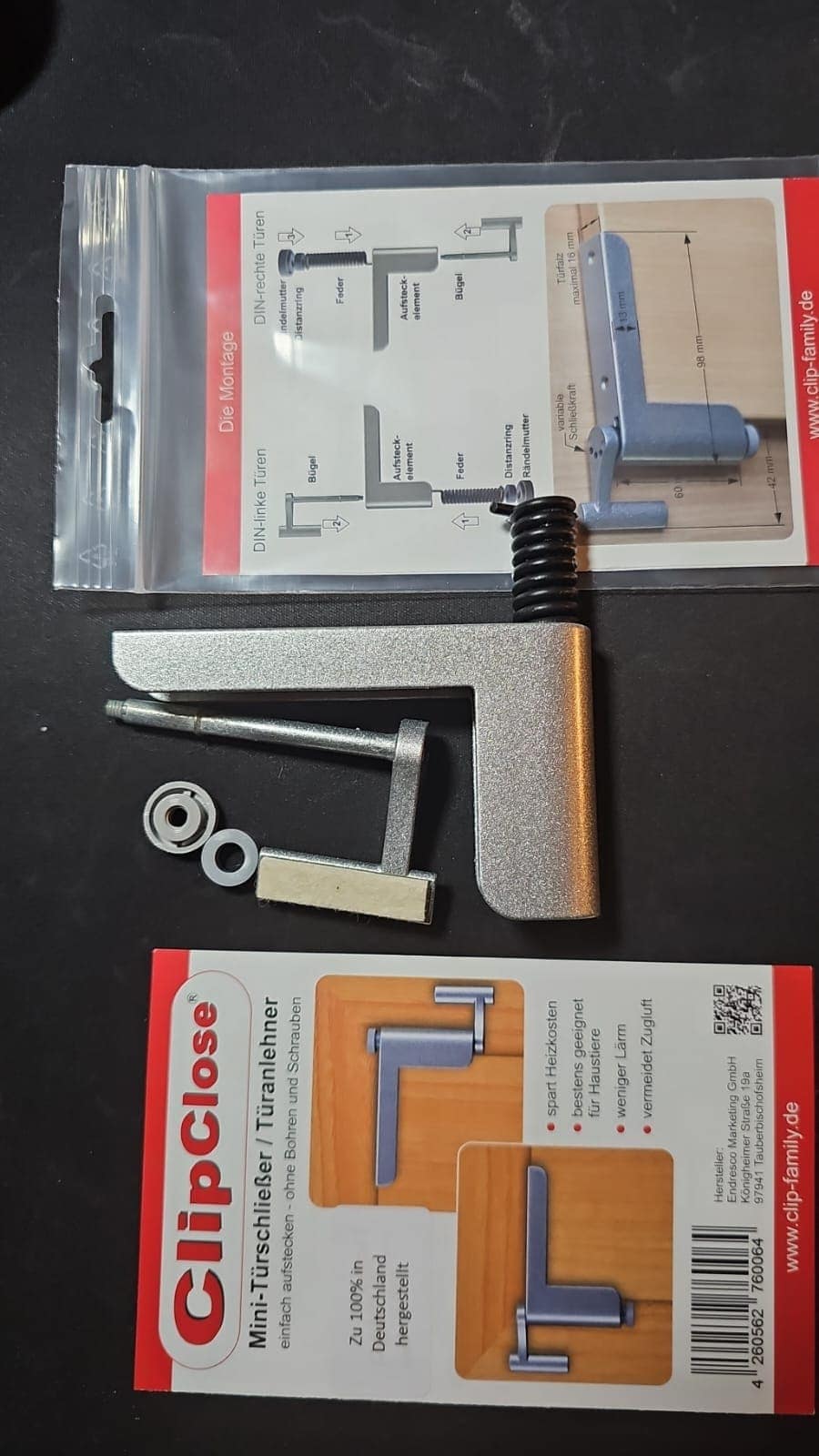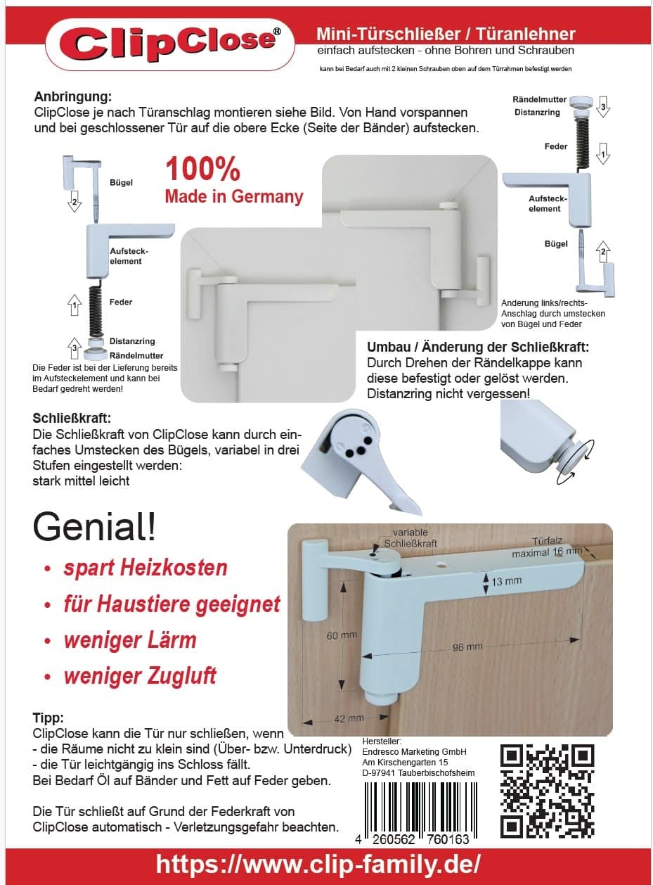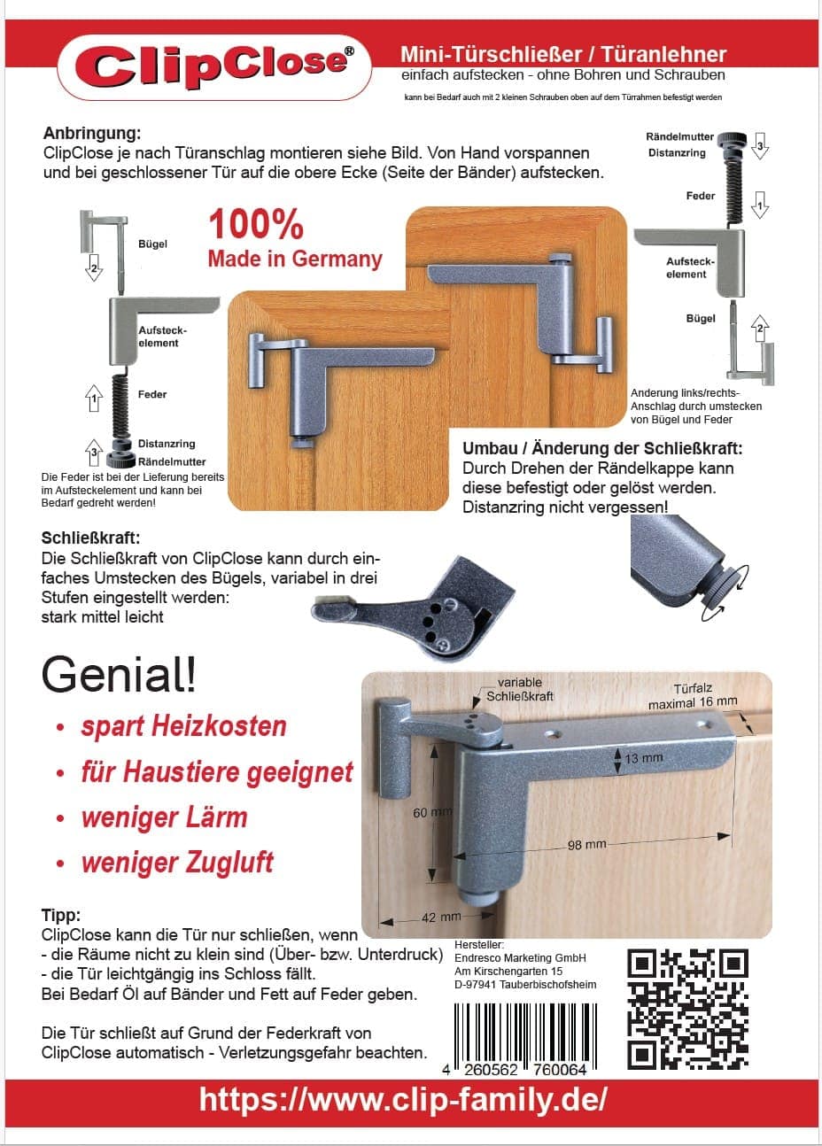 Neu am ClipClose TS sind die Rändelmutter und der Distanzring. Mit dieser Neuerung sitzt der Bügel absolut sicher und der zusammenbau ist dadurch viel einfacher. Die 3-stufig einstellbare Schließkraft (leicht, mittel, stark) ermöglicht eine Anpassung ob die Tür ins Schloss fallen oder nur leicht angelehnt werden soll. Einsatzbereich. ClipClose ist für rechts und links angeschlagene Türen geeignet (der Wechsel funktioniert durch einfaches Umsteckenb von Feder und Bügel). ClipClose ist leicht anzubringen und bei Bedarf jederzeit wieder rückstandsfrei abnehmbar.