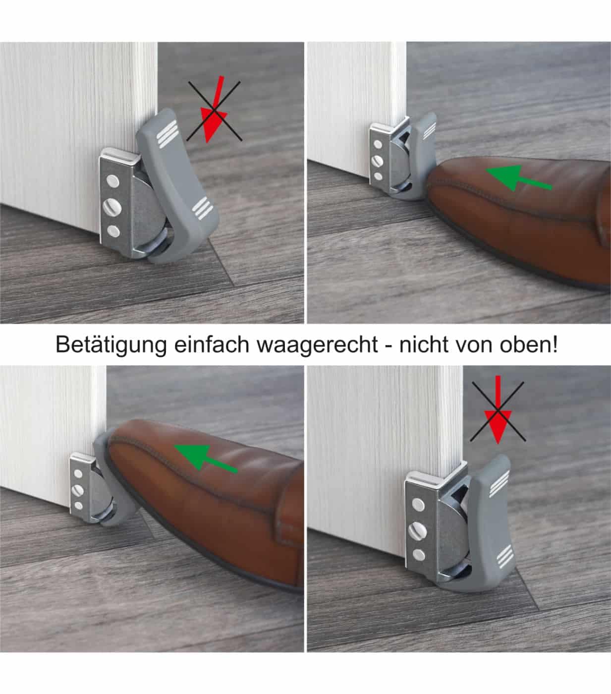 • Tür fixieren: Unteres Pedal antippen – die Tür bleibt sicher stehen.